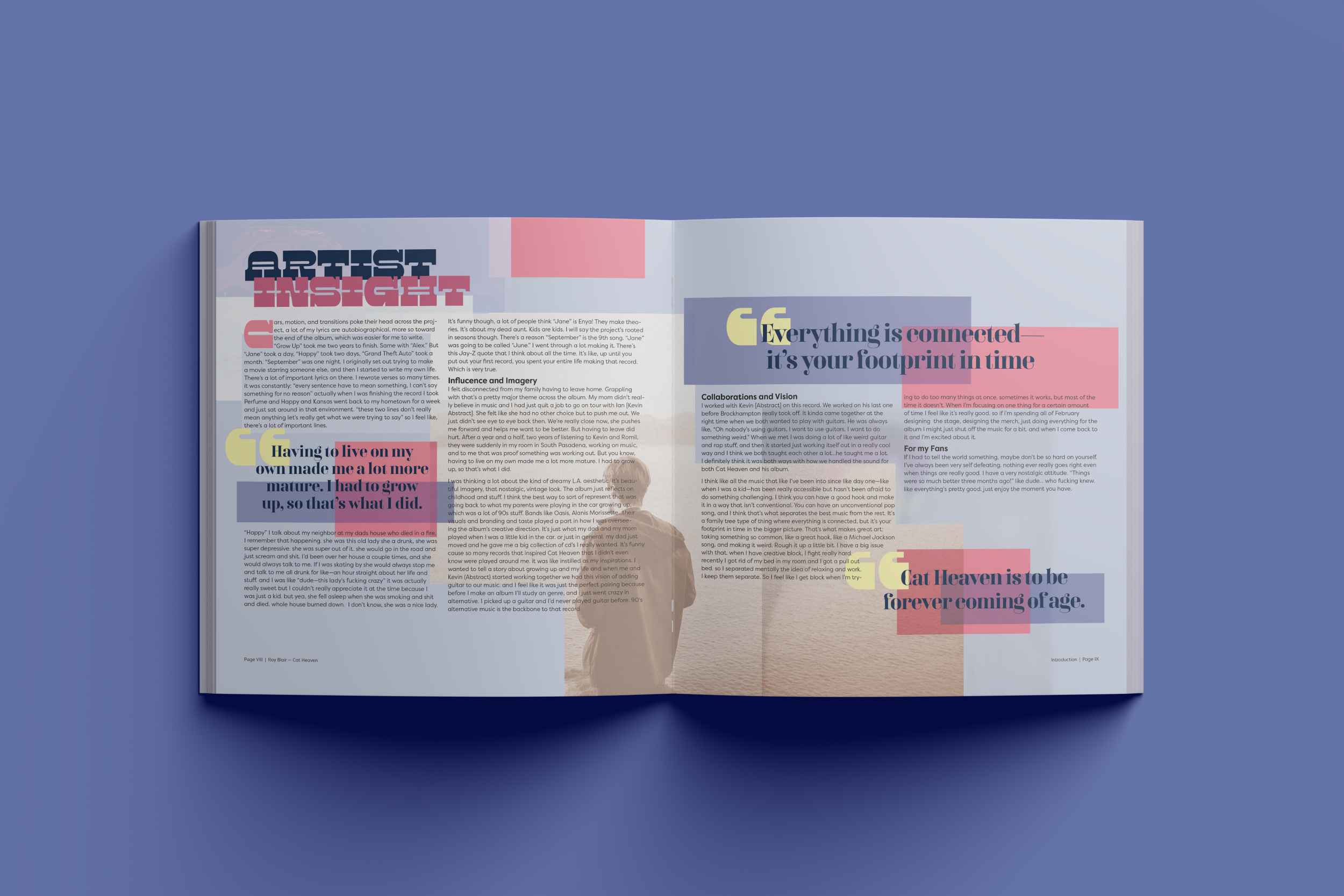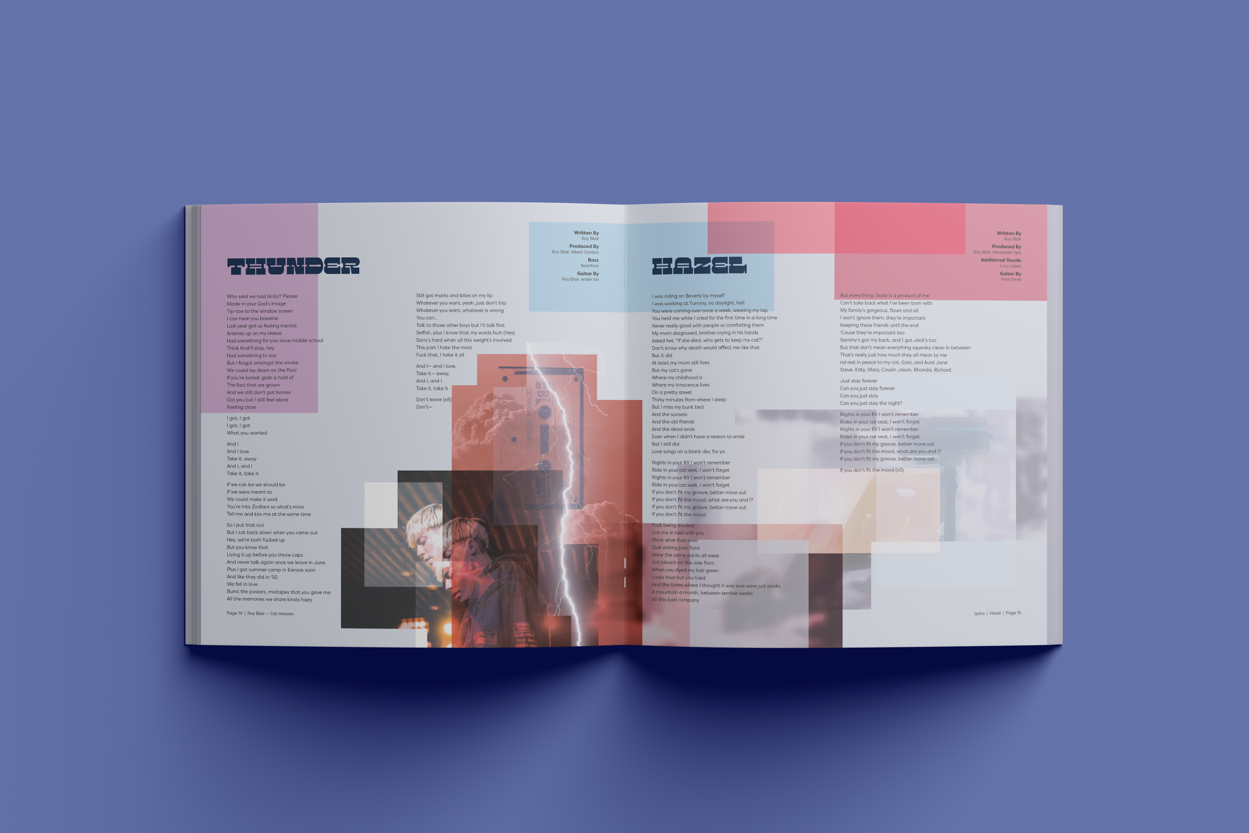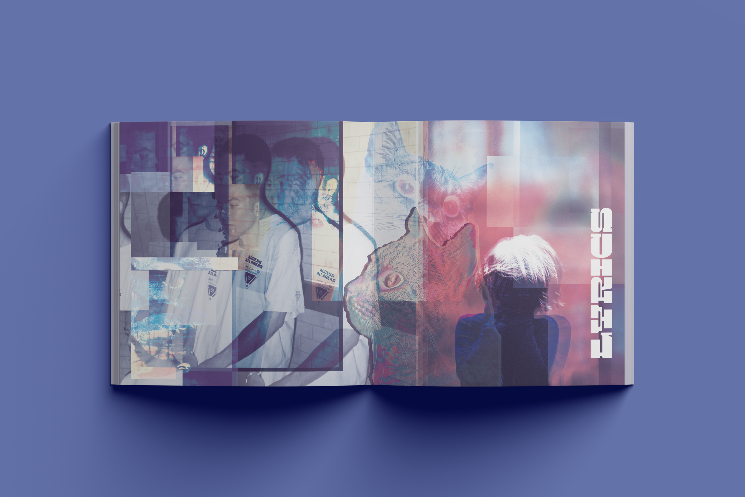 The artist explores an introspective take on coming of age, as a result my decision to utilize heavy photo-manipulation through this sort of square "chunking" and rearranging was a decision that happened early on, as it symbolized the distortion of self identity and the unease that one may feel growing into adulthood. The image choice throughout the book is filled with nostalgic imagery from my own childhood while contemplative and introspective shots of the artist fill the book as he looks ahead to the future. The color palette reflects the moody and soft feeling of the music; mixing in occasional flickers of deep reds and blues, mirroring the artist's indifference transitioning into anger towards the middle of the album.
