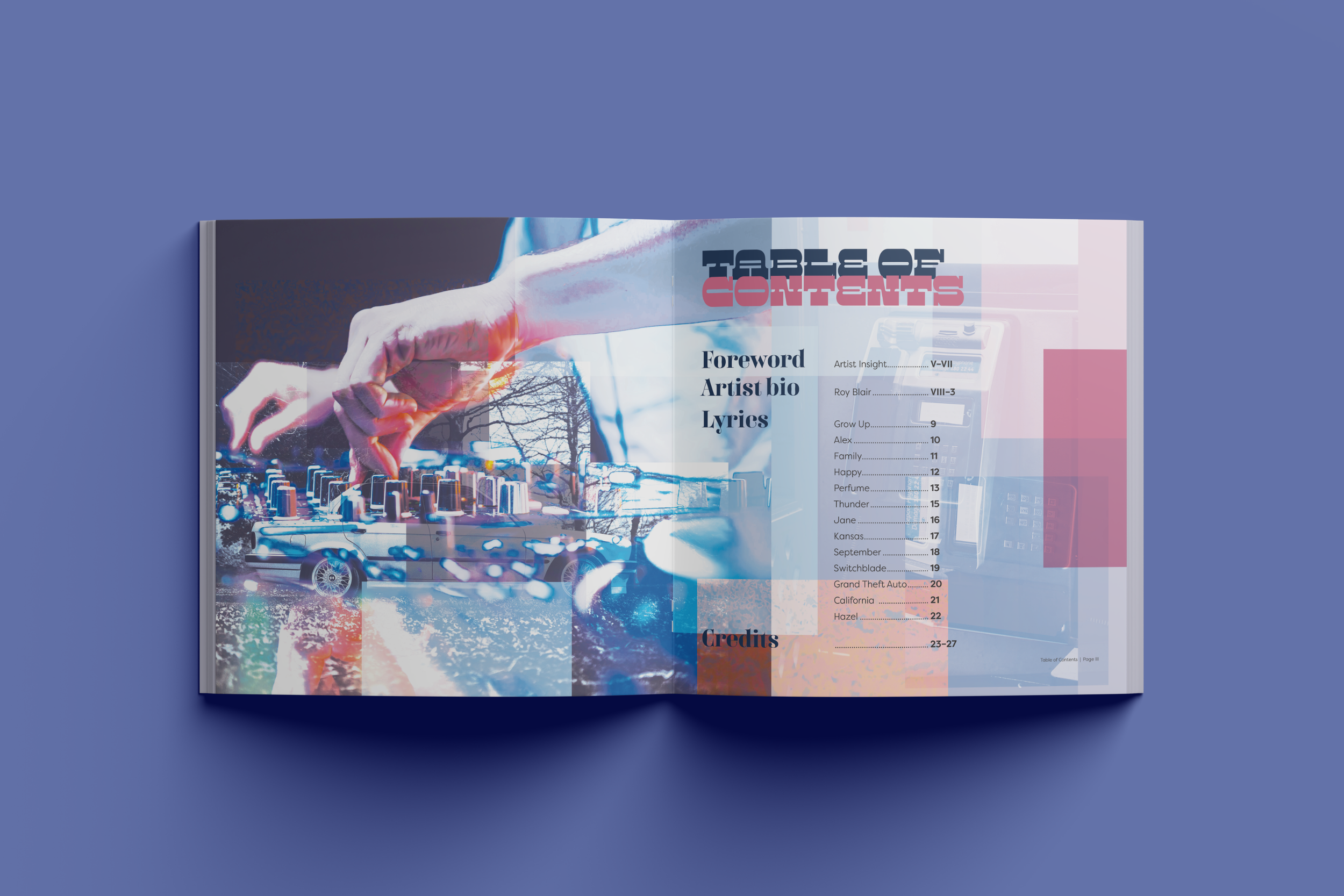 Type choice for the headlines throughout the album compliments the blocky and square look of the images as well as the bold and in your face attitude that Roy displays throughout his album. I followed a similar thought process for the pull quotes, choosing something bold but with alternating delicate strokes as the pull quotes are all intimate confessions that Roy makes in his interviews. The choice to use a rounded sans serif for the body copy was a way to maintain a more youthful and familiar look with simpler single story "a"s and "g"s.